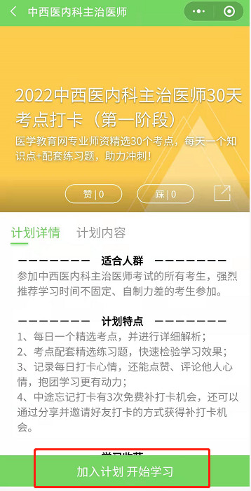 第三步:請(qǐng)選擇“您的備考計(jì)劃”,如“2022中西醫(yī)內(nèi)科主治醫(yī)師30天考點(diǎn)打卡(第一階段)”,點(diǎn)擊下方“加入計(jì)劃開(kāi)始學(xué)習(xí)”
