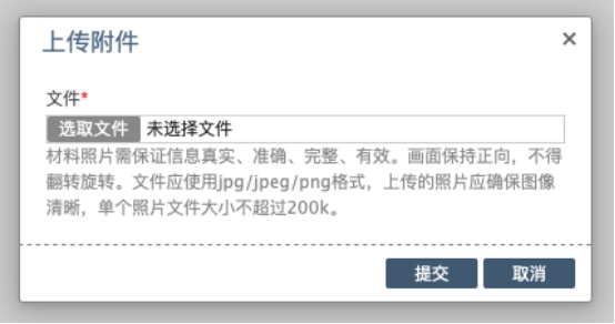 材料照片需保證信息真實(shí)、準(zhǔn)確、完整、有效。畫面保持正向,不得翻轉(zhuǎn)旋轉(zhuǎn)。文件應(yīng)使用jpg/jpeg/png格式,上傳的照片應(yīng)確保圖像清晰,單個(gè)照片文件大小不超過(guò)200k。