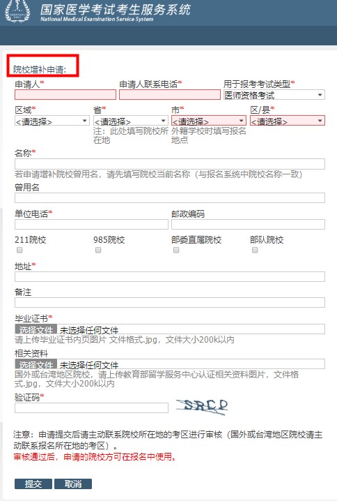 國家醫(yī)學(xué)考試網(wǎng)2021年醫(yī)師資格考試報名院校增補(bǔ)入口及流程是什么?相信很多醫(yī)師資格考生都在關(guān)注,考生應(yīng)在報名時如實填寫畢業(yè)院校,如報名時找不到自己的畢業(yè)院校,不可使用名稱相似的畢業(yè)院校名稱報名,應(yīng)先通過申報系統(tǒng)提交院校增補(bǔ)的材料申請增補(bǔ)。醫(yī)學(xué)教育網(wǎng)編輯為大家整理了具體的申請圖文教程如下: