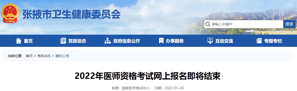 2022年中西醫(yī)執(zhí)業(yè)醫(yī)師資格考試【甘肅省張掖考點(diǎn)】網(wǎng)上報(bào)名即將結(jié)束