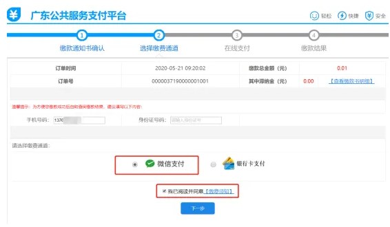 三、選擇繳費(fèi)通道,查看繳費(fèi)須知,選擇“我已閱讀并同意繳費(fèi)須知”,點(diǎn)擊“下一步”。