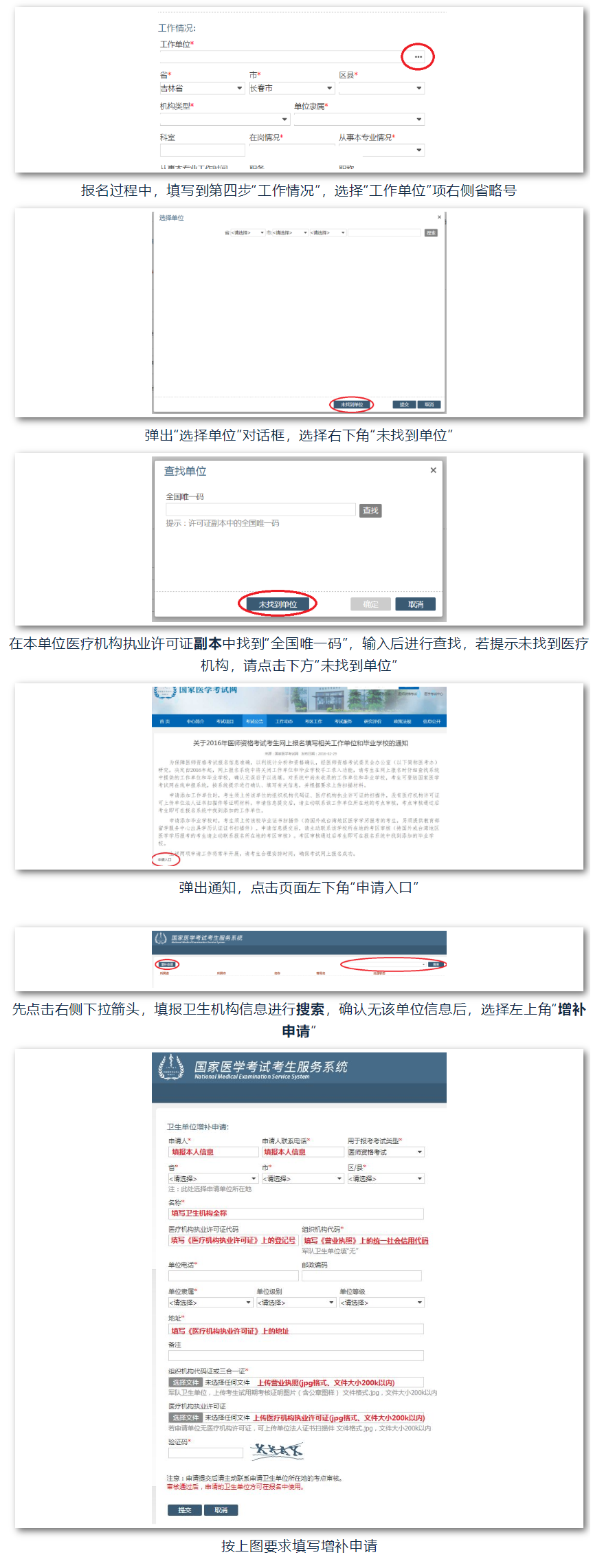 考生應(yīng)在報(bào)名時如實(shí)填寫工作單位,如報(bào)名時找不到自己的試用機(jī)構(gòu),不可使用名稱相似的機(jī)構(gòu)名稱報(bào)名,應(yīng)先通過申報(bào)系統(tǒng)提交醫(yī)療機(jī)構(gòu)的材料申請?jiān)鲅a(bǔ)。請各位考生根據(jù)以下步驟提交申請,經(jīng)審核通過后即可完成報(bào)名!