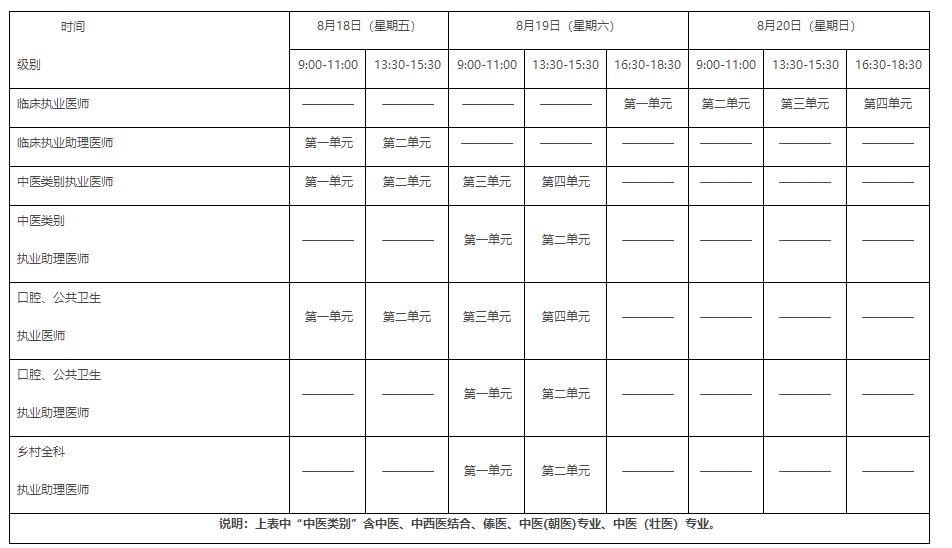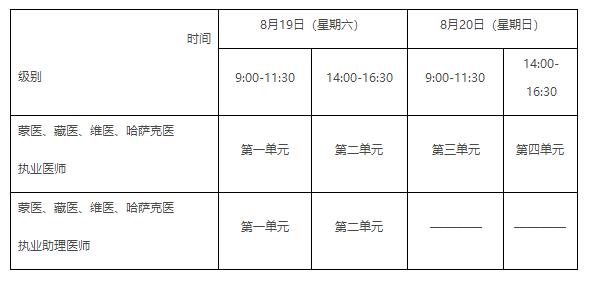 蒙醫(yī)、藏醫(yī)、維醫(yī)、哈薩克醫(yī)實行紙筆考試。其他類別實行計算機化考試。軍隊現(xiàn)役人員加試軍事醫(yī)學,院前急救崗位和兒科專業(yè)加試相應內(nèi)容。除蒙醫(yī)、藏醫(yī)、維醫(yī)、傣醫(yī)、哈薩克醫(yī)、中醫(yī)(朝醫(yī))專業(yè)、中醫(yī)(壯醫(yī))專業(yè)外,執(zhí)業(yè)醫(yī)師合格分數(shù)線為360分,執(zhí)業(yè)助理醫(yī)師合格分數(shù)線為180分??荚嚂r間如下: