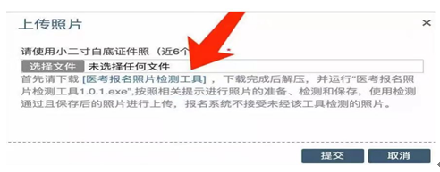 (二)考生在網(wǎng)報(bào)系統(tǒng)上傳個(gè)人小二寸白底證件照時(shí),應(yīng)按照系統(tǒng)提示內(nèi)容下載并運(yùn)行“醫(yī)考報(bào)名照片檢測(cè)工具”,網(wǎng)報(bào)系統(tǒng)只接受經(jīng)該工具檢測(cè)通過(guò)且保存后的照片進(jìn)行上傳。