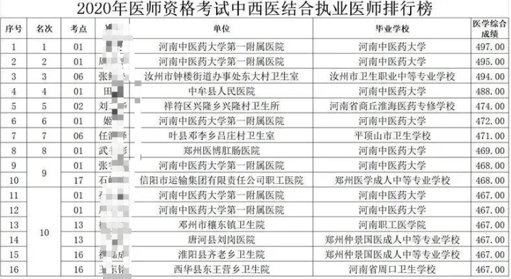 2020年國(guó)家中西醫(yī)執(zhí)業(yè)醫(yī)師資格河南考區(qū)前10名排行榜公布