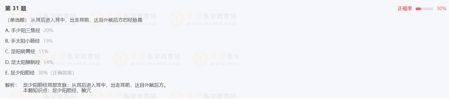 2024年中西醫(yī)執(zhí)業(yè)醫(yī)師入學(xué)測試題:從耳后進(jìn)入耳中,出走耳前,達(dá)目外眥后方的經(jīng)脈是