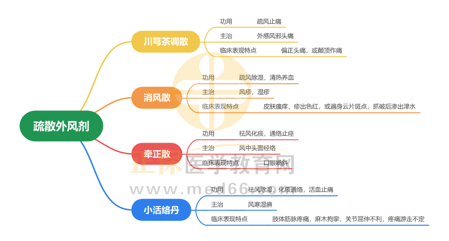 2024年中西醫(yī)執(zhí)業(yè)醫(yī)師考試中,方劑學(xué)是記憶型科目,主要考察方劑的功用、主治,尤其是功用、組成的對比,側(cè)重方劑間的對比考察。醫(yī)學(xué)教育網(wǎng)小編為大家整理“疏散外風劑”考點思維導(dǎo)圖供大家復(fù)習: