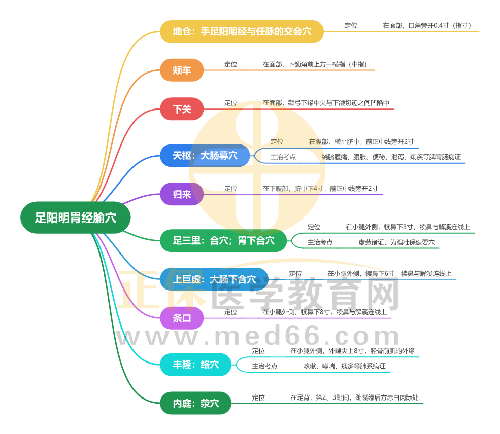 2024年中西醫(yī)執(zhí)業(yè)醫(yī)師考試中,針灸學主要以病例題目考察,側重辨證主穴配穴的選取。尤其是配穴要引起重視。疾病治療的主穴和配穴,以內科病癥為主,涉及外婦兒的內容不多。比如:治療目赤腫痛肝膽火盛證,除主穴外,還應選取的配穴是什么。醫(yī)學教育網小編為大家整理“足陽明胃經腧穴”考點思維導圖供大家復習: