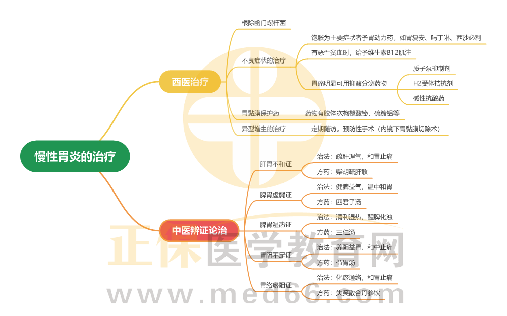 2024年中西醫(yī)執(zhí)業(yè)醫(yī)師“中西醫(yī)內(nèi)科學-慢性胃炎的治療”考點思維導圖