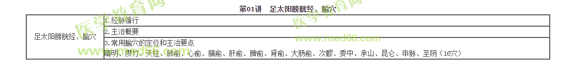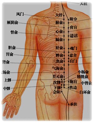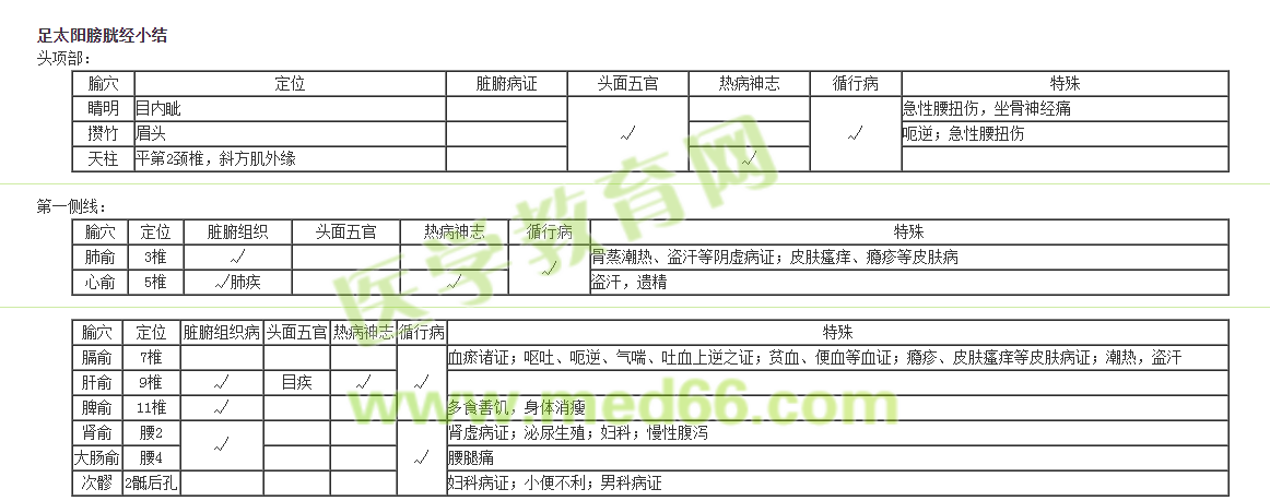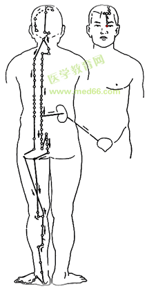 有穴通路:起目?jī)?nèi)眥――頭項(xiàng)――腰背第一(督脈旁1.5寸)、二(督脈旁3寸)側(cè)線――下肢外側(cè)后緣――小趾(睛明--至陰)