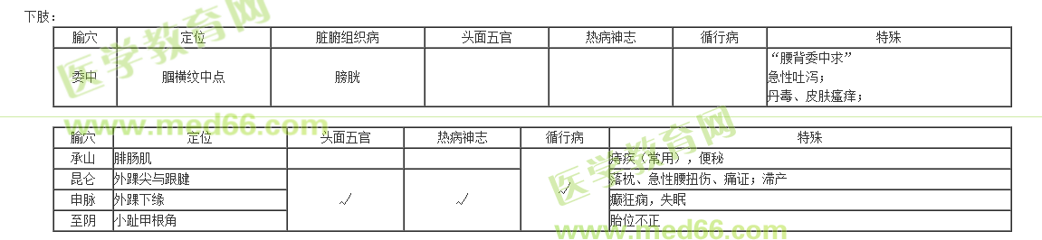 【主治】①腰背痛、下肢痿痹等腰及下肢病證(腰背委中求);②腹痛、急性吐瀉等急癥;③小便不利,遺尿;④丹毒,皮膚瘙癢,疔瘡。