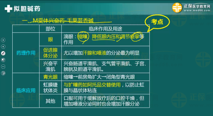 毛果蕓香堿的作用和應(yīng)用是歷年考察的重點(diǎn)和易混淆點(diǎn),大家對(duì)于此部分內(nèi)容的學(xué)習(xí)要引起足夠的重視。