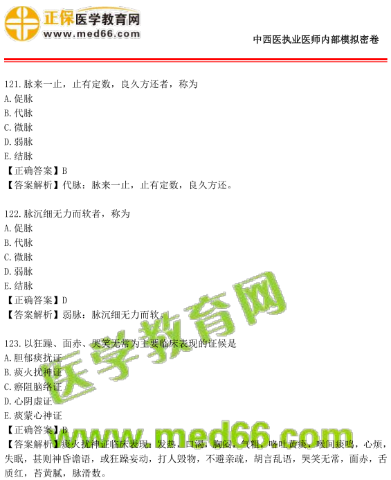 為了幫助2019年中西醫(yī)執(zhí)業(yè)醫(yī)師資格考試的考生及時(shí)的掌握命題規(guī)律,網(wǎng)校專(zhuān)業(yè)教學(xué)團(tuán)隊(duì)選取歷年具有代表性的試題組卷(綜合考慮了各科分值占比及難易度情況),對(duì)廣大考生進(jìn)行免費(fèi)實(shí)戰(zhàn)??荚u(píng)測(cè),以下是醫(yī)學(xué)教育網(wǎng)整理的“第121-125題|2019年中西醫(yī)執(zhí)業(yè)醫(yī)師??济芫淼?單元”希望可以幫助考生清楚自己的復(fù)習(xí)效果。