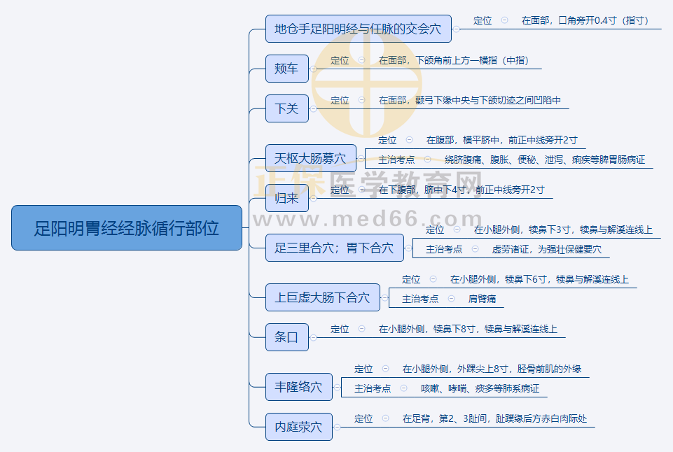 中西醫(yī)執(zhí)業(yè)醫(yī)師針灸學(xué)“足陽(yáng)明胃經(jīng)經(jīng)脈循行部位”思維導(dǎo)圖
