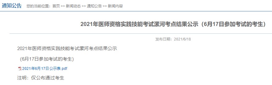 2021年醫(yī)師資格實踐技能考試漯河考點結(jié)果公示(6月17日參加考試的考生)公示已發(fā)布。