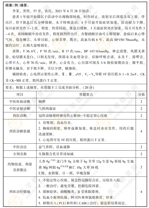 2022年中西醫(yī)執(zhí)業(yè)醫(yī)師實踐技能第一站【病例分析】練習題2號:胸痹