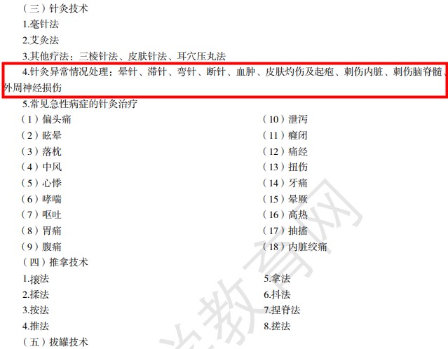 2021年必考!中西醫(yī)執(zhí)業(yè)醫(yī)師實(shí)踐技能針灸異常情況9種如何處理,2021年中西醫(yī)執(zhí)業(yè)醫(yī)師考試實(shí)踐技能考試大綱中,提到了針灸技術(shù)的考察內(nèi)容,針灸異常情況處理:暈針、滯針、彎針、斷針、血腫、皮膚灼傷及起皰、刺傷內(nèi)臟、刺傷腦脊髓、外周神經(jīng)損傷。這是今年的考試大綱,所以各位考生要熟記并且掌握這9種針灸異常情況的處理辦法。醫(yī)學(xué)教育網(wǎng)編輯為您整理了往年課程講義,供大家參考學(xué)習(xí)。最新資料還請大家以最新課程更新為準(zhǔn)。立即購課>>