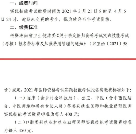 2021年醫(yī)師資格考試實(shí)踐技能考試湖南考區(qū)考生繳費(fèi)通知