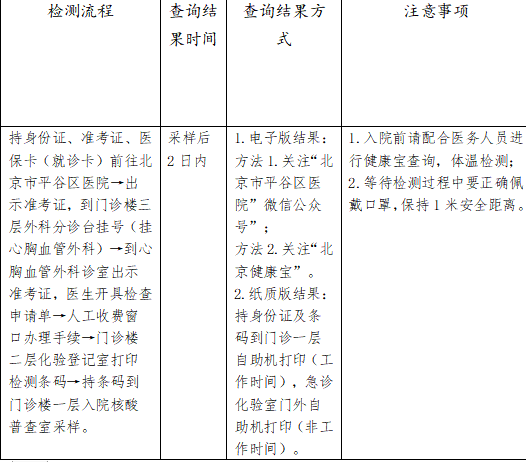 持身份證、準(zhǔn)考證、醫(yī)??ǎň驮\卡)前往北京市平谷區(qū)醫(yī)院→出示準(zhǔn)考證,到門診樓三層外科分診臺(tái)掛號(hào)(掛心胸血管外科)→到心胸血管外科診室出示準(zhǔn)考證,醫(yī)生開(kāi)具檢查申請(qǐng)單→人工收費(fèi)窗口辦理手續(xù)→門診樓二層化驗(yàn)登記室打印檢測(cè)條碼→持條碼到門診樓一層入院核酸普查室采樣。