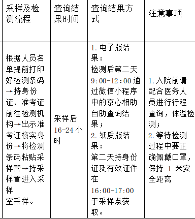 采樣及檢測(cè)流程:根據(jù)人員名單提前打印好檢測(cè)條碼→持身份證、準(zhǔn)考證前往檢測(cè)機(jī)構(gòu)→出示準(zhǔn)考證核實(shí)身份→將檢測(cè)條碼粘貼采樣管→持采樣管進(jìn)入采樣室采樣。