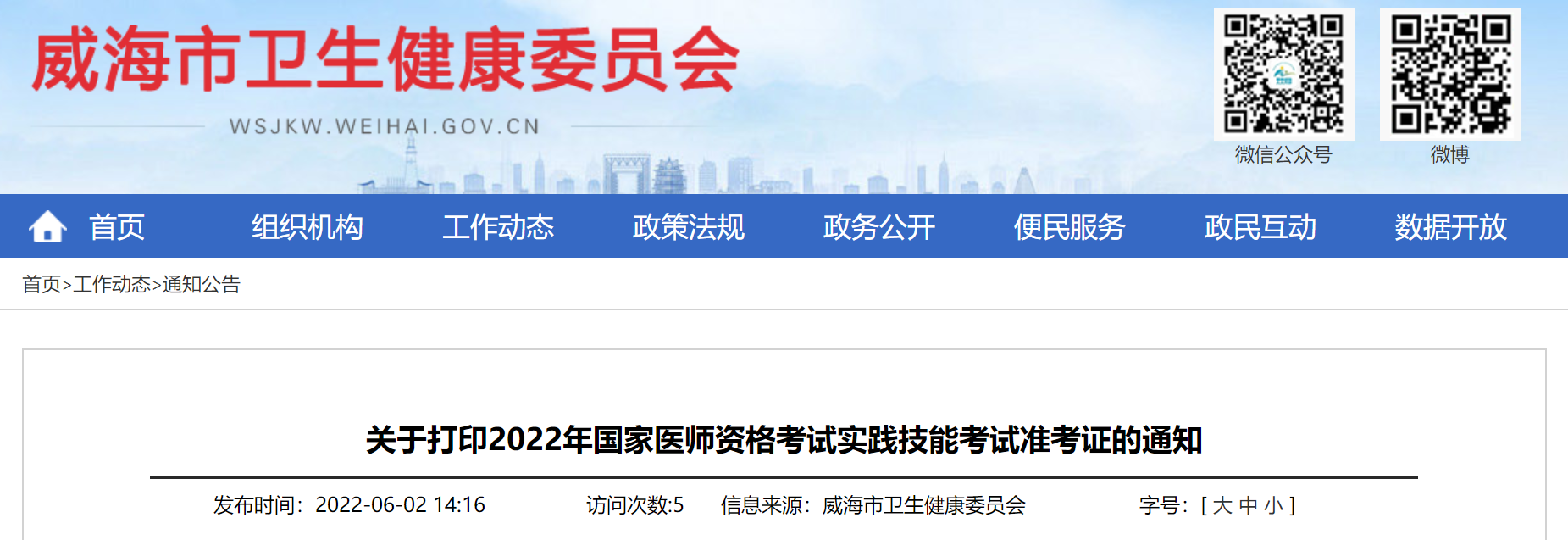 山東省威??键c關于打印2022年中西醫(yī)執(zhí)業(yè)醫(yī)師實踐技能考試準考證的通知