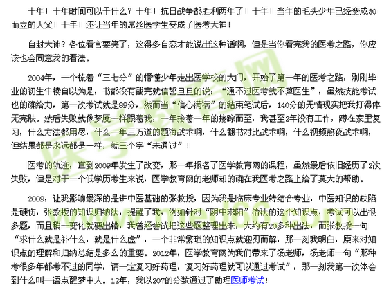 編者按:在2014年我的醫(yī)考之路大型征文活動中,醫(yī)學教育網(wǎng)學員積極參與,為我們帶來了很多精彩的文章,執(zhí)業(yè)醫(yī)師考試學員more****,根據(jù)自己參加2014年執(zhí)業(yè)醫(yī)師考試的經(jīng)歷寫了這篇:《我的醫(yī)考之路--十年醫(yī)考路,屌絲變大神》,此篇文章在征文比賽中獲得了三等獎的好成績,讓我們一起來分享他的經(jīng)驗吧!