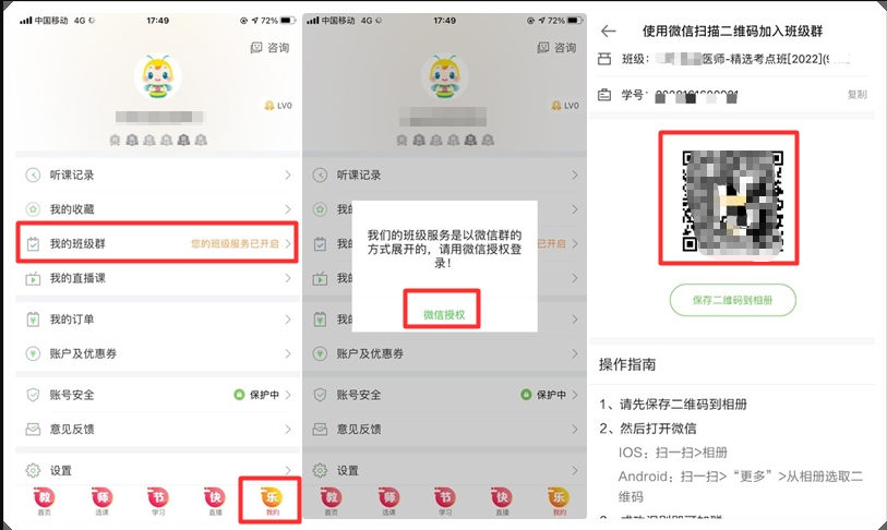 手機(jī)端:下載醫(yī)學(xué)教育網(wǎng)APP(下載鏈接>>),登錄之后,進(jìn)入“我的”,點(diǎn)擊“我的班級(jí)群”,會(huì)提示“微信授權(quán)”授權(quán)之后,即可進(jìn)入社群服務(wù)操作指南界面??梢圆榭丛敿?xì)的操作說(shuō)明。