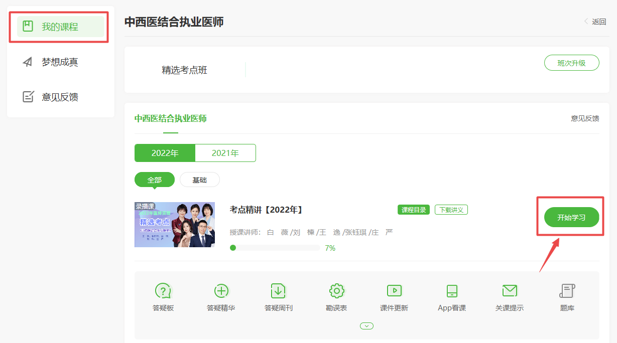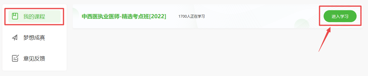 喊你學(xué)習(xí)啦!2022年中西醫(yī)執(zhí)業(yè)醫(yī)師“精選考點(diǎn)班”新課更新!快來解鎖2022年新課程!已購課同學(xué)可以直接進(jìn)入我的網(wǎng)校我的家-我的課程-精選考點(diǎn)班進(jìn)入學(xué)習(xí)!未購課學(xué)員點(diǎn)擊此處進(jìn)入選擇(點(diǎn)此進(jìn)入購課>),具體看課位置如下: