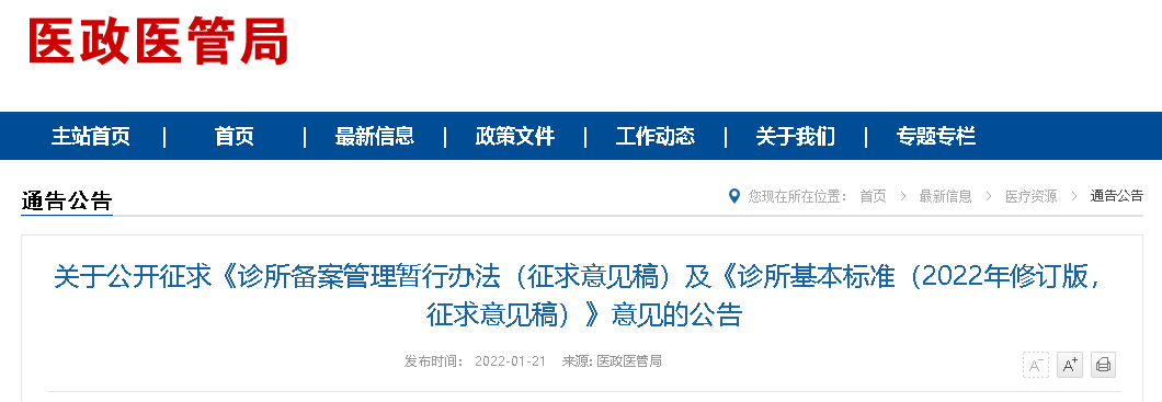 關(guān)于公開征求《診所備案管理暫行辦法(征求意見稿)及《診所基本標(biāo)準(zhǔn)(2022年修訂版,征求意見稿)》意見的公告