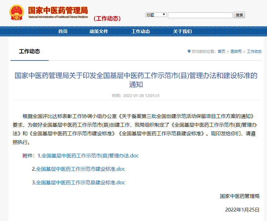 國(guó)家中醫(yī)藥管理局關(guān)于印發(fā)全國(guó)基層中醫(yī)藥工作示范市(縣)管理辦法和建設(shè)標(biāo)準(zhǔn)的通知發(fā)布,根據(jù)全國(guó)評(píng)比達(dá)標(biāo)表彰工作協(xié)調(diào)小組辦公室《關(guān)于備案第三批全國(guó)創(chuàng)建示范活動(dòng)保留項(xiàng)目工作方案的通知》要求,為做好全國(guó)基層中醫(yī)藥工作示范市(縣)創(chuàng)建工作,國(guó)家中醫(yī)藥管理局組織制定了《全國(guó)基層中醫(yī)藥工作示范市(縣)管理辦法》和《全國(guó)基層中醫(yī)藥工作示范市建設(shè)標(biāo)準(zhǔn)》《全國(guó)基層中醫(yī)藥工作示范縣建設(shè)標(biāo)準(zhǔn)》。