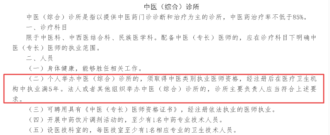 (二)個(gè)人舉辦中西醫(yī)結(jié)合診所的,須取得中醫(yī)類(lèi)別中西醫(yī)結(jié)合專(zhuān)業(yè)執(zhí)業(yè)醫(yī)師資格,經(jīng)注冊(cè)后在醫(yī)療衛(wèi)生機(jī)構(gòu)中執(zhí)業(yè)滿5年。法人或者其他組織舉辦中西醫(yī)結(jié)合診所的,診所主要負(fù)責(zé)人應(yīng)當(dāng)符合上述要求。
