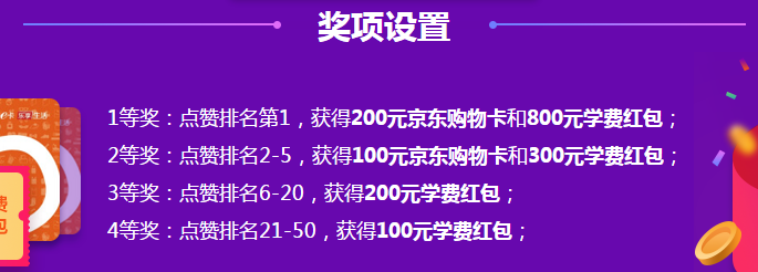 3.獲獎規(guī)則:截止12月11日23:59,集贊數量排名前50的學員將獲得相應的獎品(點贊數量相同的學員,排行榜按照獲得相同點贊數時間的先后順序進行排名,獎品的發(fā)放以此排名為準);
