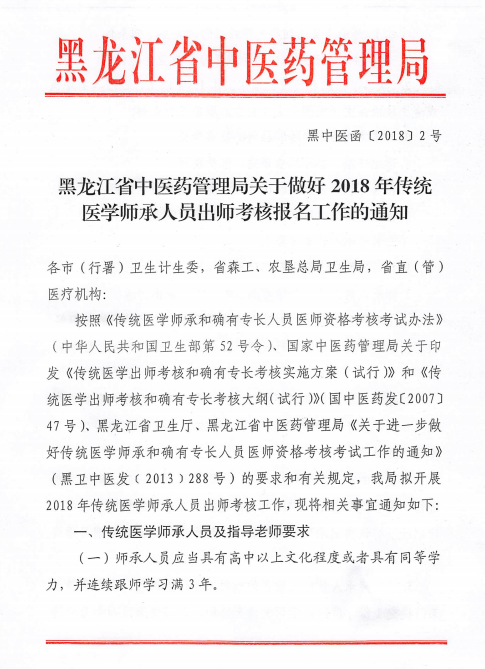 黑龍江省中醫(yī)藥管理局2018年傳統(tǒng)醫(yī)學(xué)師承人員出師考核報(bào)名工作的通知現(xiàn)已公布,為此,醫(yī)學(xué)教育網(wǎng)為大家搜集整理如下內(nèi)容,供大家參考,希望對(duì)大家有所幫助。