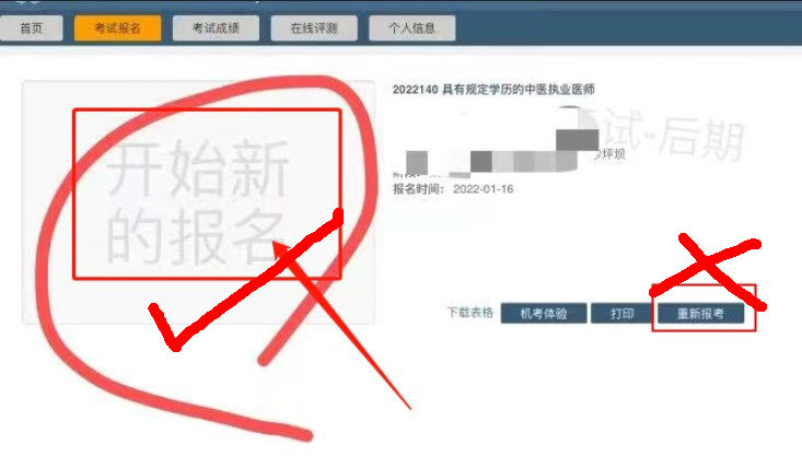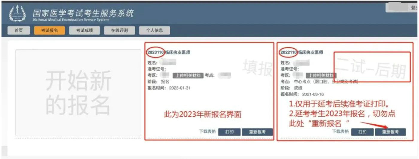 但是要重點提醒要參加2023年報名的延考考生,一定要注意!在國家醫(yī)學考試網報名系統(tǒng)中,一定要點擊"開始新的報名",而不是"重新報考"!如果點擊了重新報考,則延考的數(shù)據(jù)將會被刪除!無法正常打印延考準考證,參加2月17號舉行的延考考試,一定要注意!