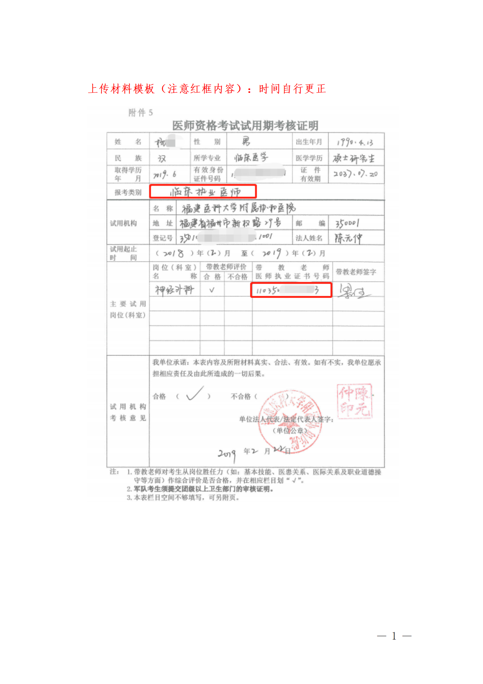 報名參加醫(yī)師資格考試,需要提供考生試用(或實習)機構出具的滿一年的《醫(yī)師資格考試試用期考核證明》。根據(jù)《遼寧錦州考點關于2023年醫(yī)師資格考試報名資格審核的通知》的相關內(nèi)容,醫(yī)學教育網(wǎng)小編為大家總結了2023年醫(yī)師資格考試報名《醫(yī)師資格考試試用期考核證明》填寫范例如下:
