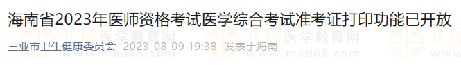 海南省2023年醫(yī)師資格考試醫(yī)學(xué)綜合考試準(zhǔn)考證打印功能已開(kāi)放,提醒中西醫(yī)執(zhí)業(yè)醫(yī)師考生考試安排2023年8月18日-19日,各位考生做好考前準(zhǔn)備工作,避免錯(cuò)過(guò)考試,具體通知內(nèi)容醫(yī)學(xué)教育網(wǎng)整理如下: