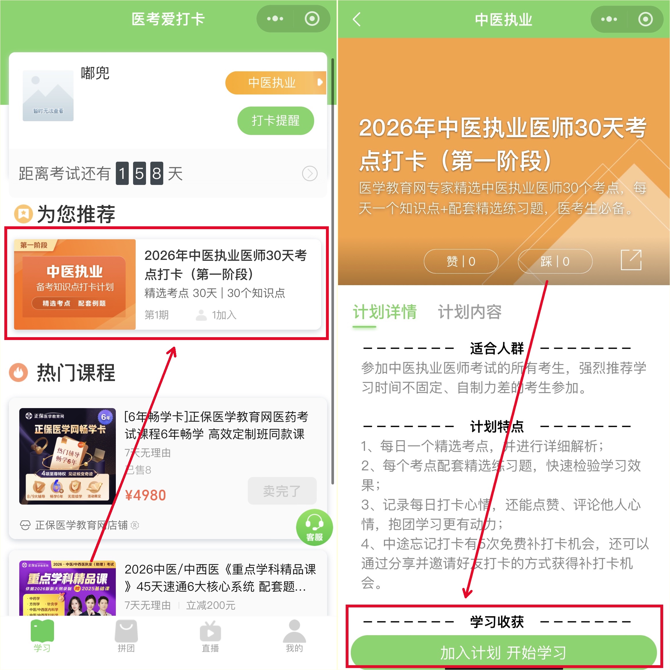 請選擇“您的備考計(jì)劃”,如中醫(yī)執(zhí)業(yè)醫(yī)師備考復(fù)習(xí)計(jì)劃(第一階段),然后點(diǎn)擊下方“加入計(jì)劃開始學(xué)習(xí)”按鈕,開始正式進(jìn)入打卡學(xué)習(xí);