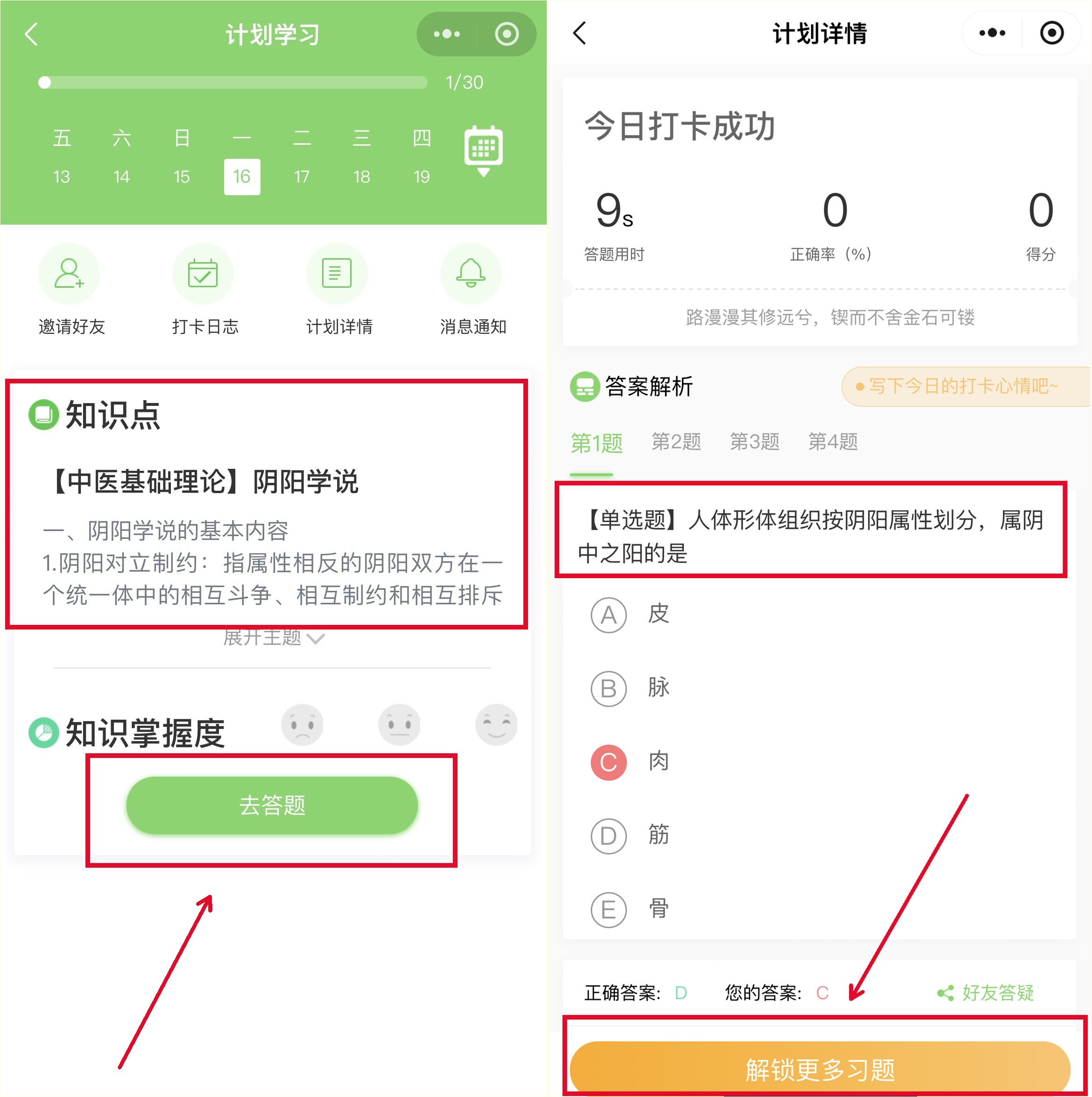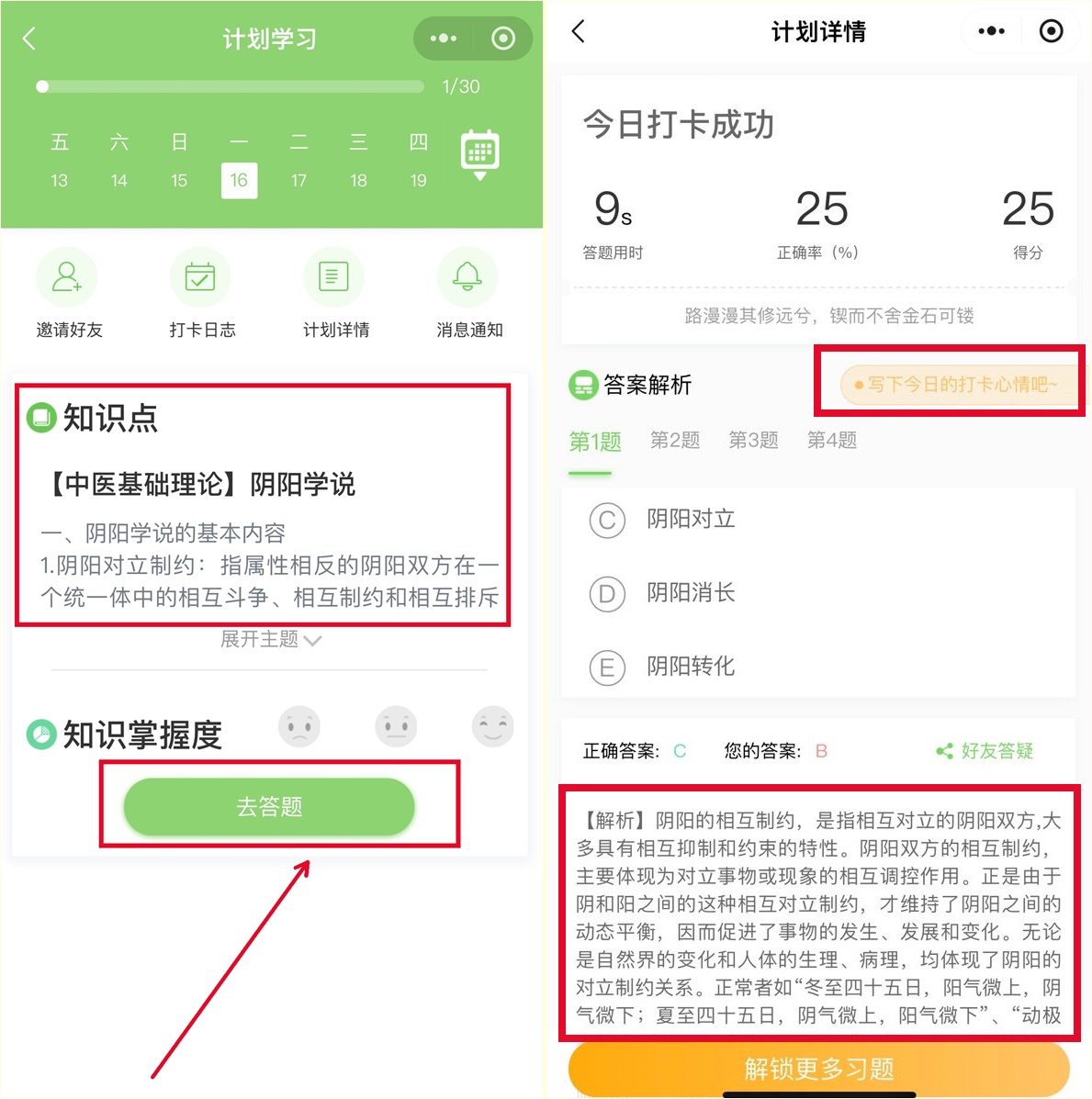 做完題后,可以查看每道題的解析和整體做題情況,進(jìn)入計(jì)劃頁面也可點(diǎn)擊“今日打卡心情”,輸入您要分享記錄的內(nèi)容,提交即可完成打卡。