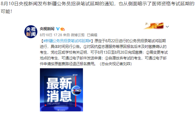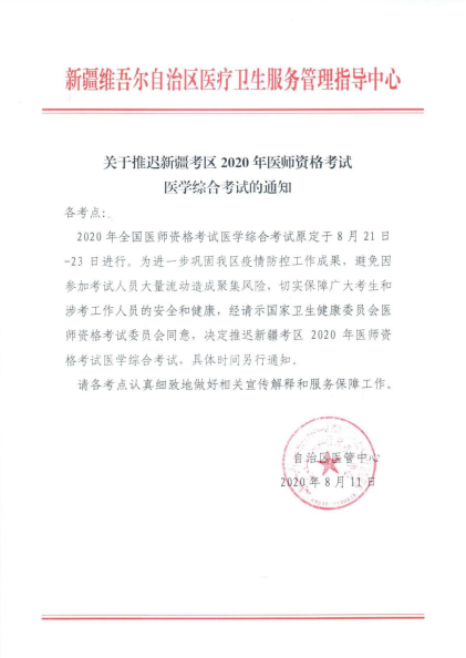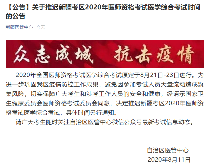 2020年醫(yī)師資格筆試考試新疆考區(qū)確定推遲!具體考試時間,另行通知?。ㄒ韵聢D片來源于醫(yī)學教育網(wǎng)社群,由社群學員提供,目前暫未在官方網(wǎng)站查到該通知?。?/p>
