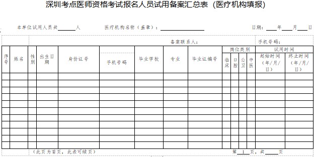 深圳考點2021年醫(yī)師資格考試報名人員試用備案匯總表樣表下載,深圳考點醫(yī)師資格考試報名人員試用備案匯總表(醫(yī)療機構填報),醫(yī)學教育網(wǎng)編輯為您整理如下: