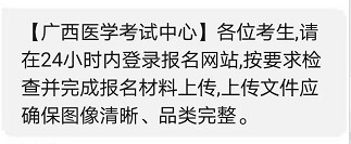 河北、山東、廣西等地,審核通知會以短信內容發(fā)送到手機,如圖,如果需要更新/補充考試材料照片的,收到短信后,考生材料上傳功能會同時解鎖。這里所說的24小時是盡快,并不是一定在24小時之內,但是希望考友越快越好,不要拖拉。
