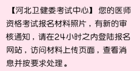 短信通知以山東為例:【山東衛(wèi)健委醫(yī)管中心】您的醫(yī)師資格考試報名材料照片,有新的審核通知,請在 24 小時之內登陸報名網(wǎng)站,訪問報名材料上傳頁面,查看消息并按要求處理。(查看官方通知>>)