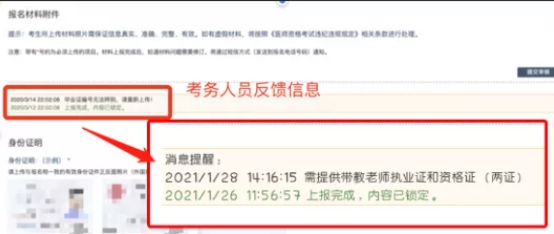 線上審核的時期,若考生收到審核短信、國家醫(yī)學考試中心公眾號信息反饋,或登錄報名網(wǎng)站訪問文件上傳頁面,在頁面上部可查看反饋意見,應根據(jù)反饋內容,對解鎖的材料進行調整并重新完成上傳。