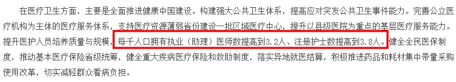 胡祖才稱,提升醫(yī)護(hù)人員培養(yǎng)質(zhì)量與規(guī)模,每千人口擁有執(zhí)業(yè)(助理)醫(yī)師數(shù)提高到3.2人、注冊護(hù)士數(shù)提高到3.8人。