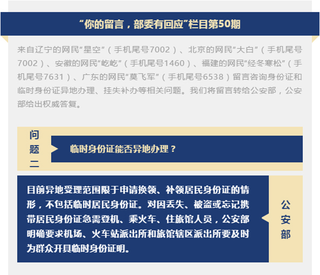 來自福建的網(wǎng)民“經(jīng)冬寒松”(手機(jī)尾號7631)說:總理您好,我是上海大學(xué)的學(xué)生,這次在江西實(shí)習(xí)期間丟失了身份證,聽聞國家推出異地辦理身份證政策后,我到當(dāng)?shù)嘏沙鏊a(bǔ)辦了身份證,但是制證需要一定時間,因此我申請辦理臨時身份證,但是當(dāng)?shù)嘏沙鏊f不能辦理臨時身份證。希望國家能推進(jìn)異地補(bǔ)辦臨時身份證,讓群眾辦事更加便捷。