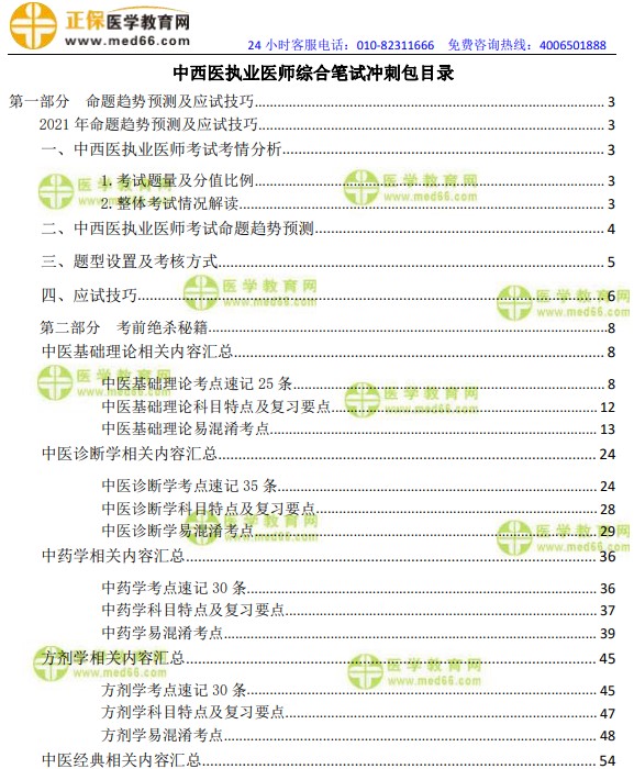 2021年中西醫(yī)執(zhí)業(yè)醫(yī)師資格《綜合筆試沖刺包》由醫(yī)學(xué)教育網(wǎng)專業(yè)教輔團(tuán)隊(duì)精心籌備,涵蓋命題趨勢(shì)及應(yīng)試技巧,考情分析、分值占比、整體考試情況解讀、命題趨勢(shì)預(yù)測(cè)、題型設(shè)置及考核方式、應(yīng)試技巧等,更有各科目考點(diǎn)絕殺資料,涵蓋所有科目考點(diǎn)速記、科目特點(diǎn)及復(fù)習(xí)要點(diǎn),易混淆知識(shí)點(diǎn)。