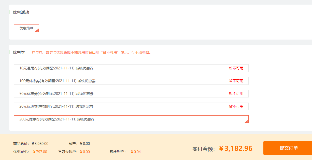 選擇好班次提交訂單別忘了檢查優(yōu)惠券勾選情況。