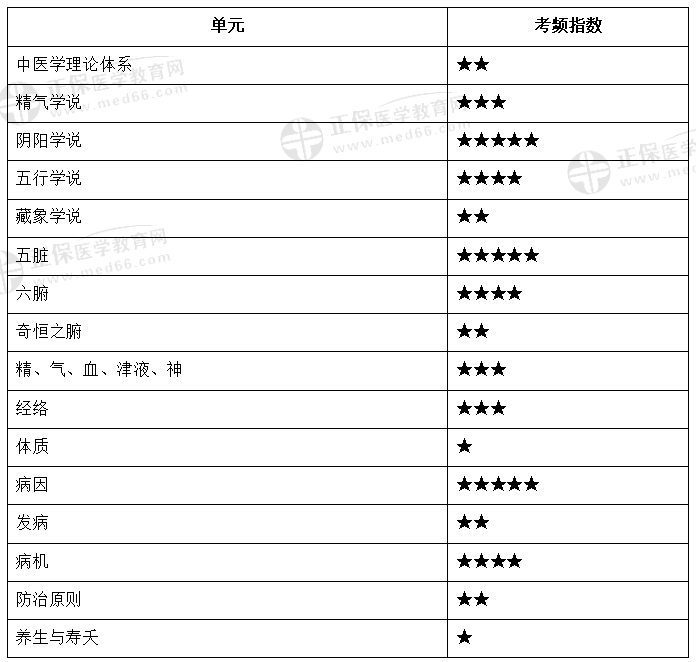 《中醫(yī)基礎(chǔ)理論》各單元節(jié)基本上都會有考題出現(xiàn),其中重點考查的章節(jié)有陰陽學(xué)說、五行學(xué)說、五臟、氣血津液、病因、病機。