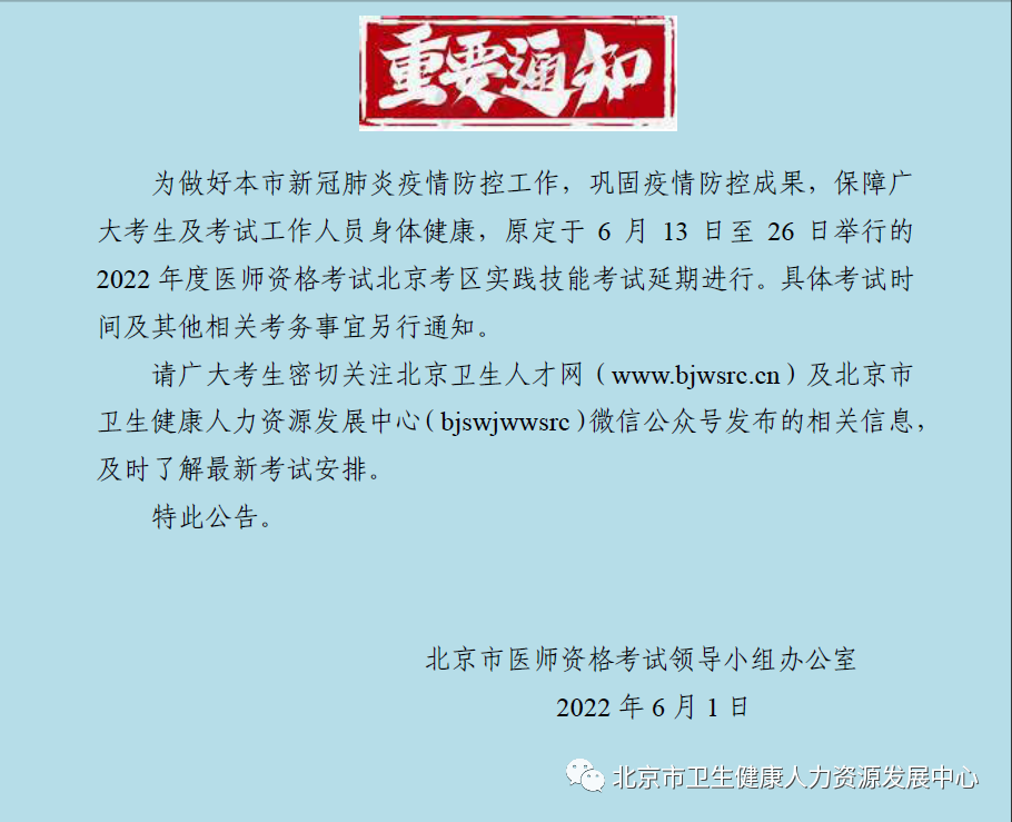 關(guān)于北京考區(qū)延期開展2022年度醫(yī)師資格考試實(shí)踐技能考試工作的公告