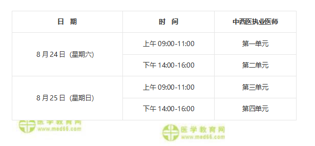 2019年中西醫(yī)執(zhí)業(yè)醫(yī)師醫(yī)學(xué)綜合筆試全國統(tǒng)一考試時(shí)間為8月24、25日,全國實(shí)行計(jì)算機(jī)化考試,具體請以準(zhǔn)考證為準(zhǔn);